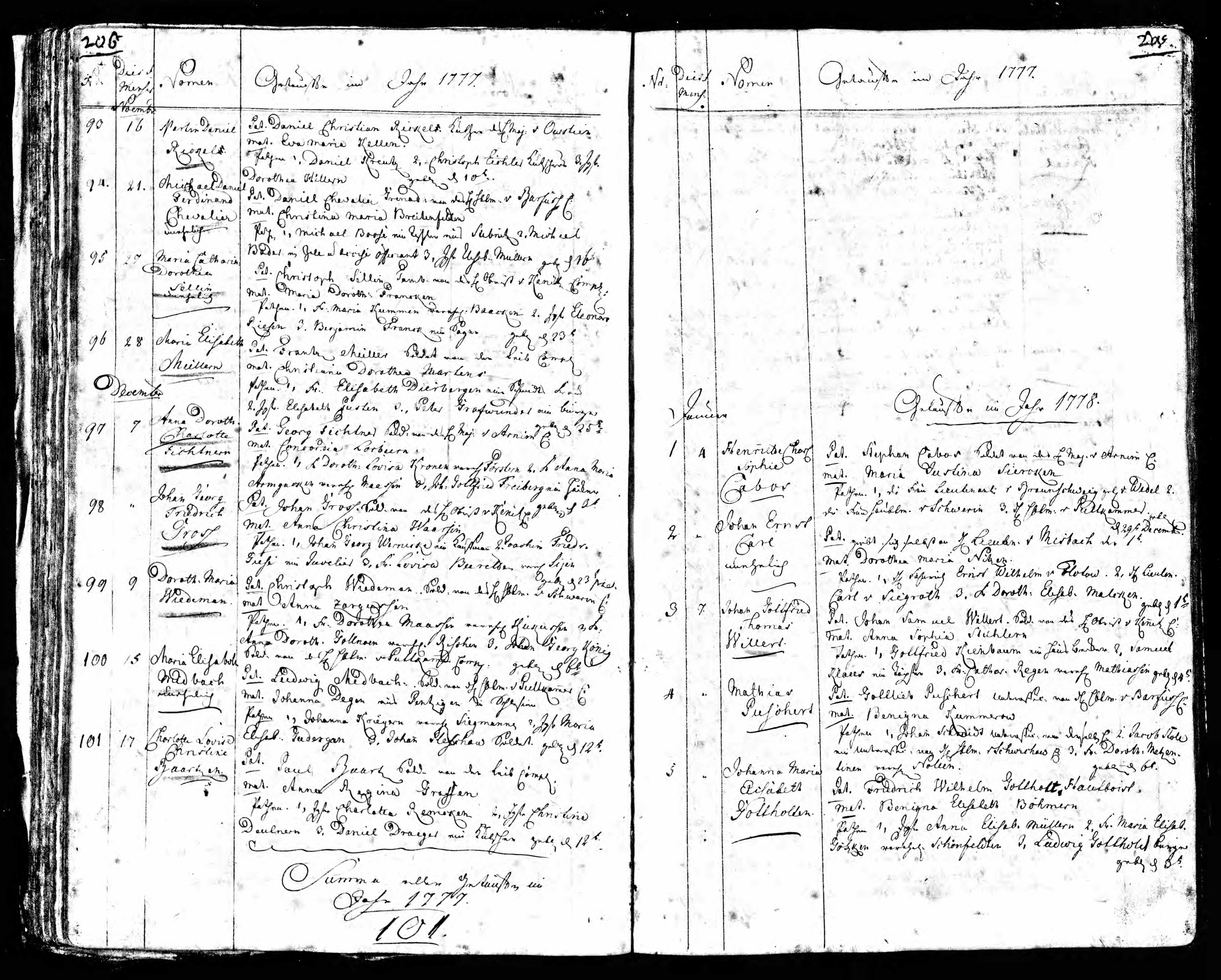 "Henriette Charl. Sophie Cabos — Pat. Stephan Cabos Soldat von dem H Maj v Arnim — Mat Marie Justine Siercken — Pathen: 1. Die Frau Lieutenant v Braunschweig geb v Wedel, 2. Frau Haubtm. v Schwerin, 3. H... v Puttkammer — Geboren 29. Dezember 1777"