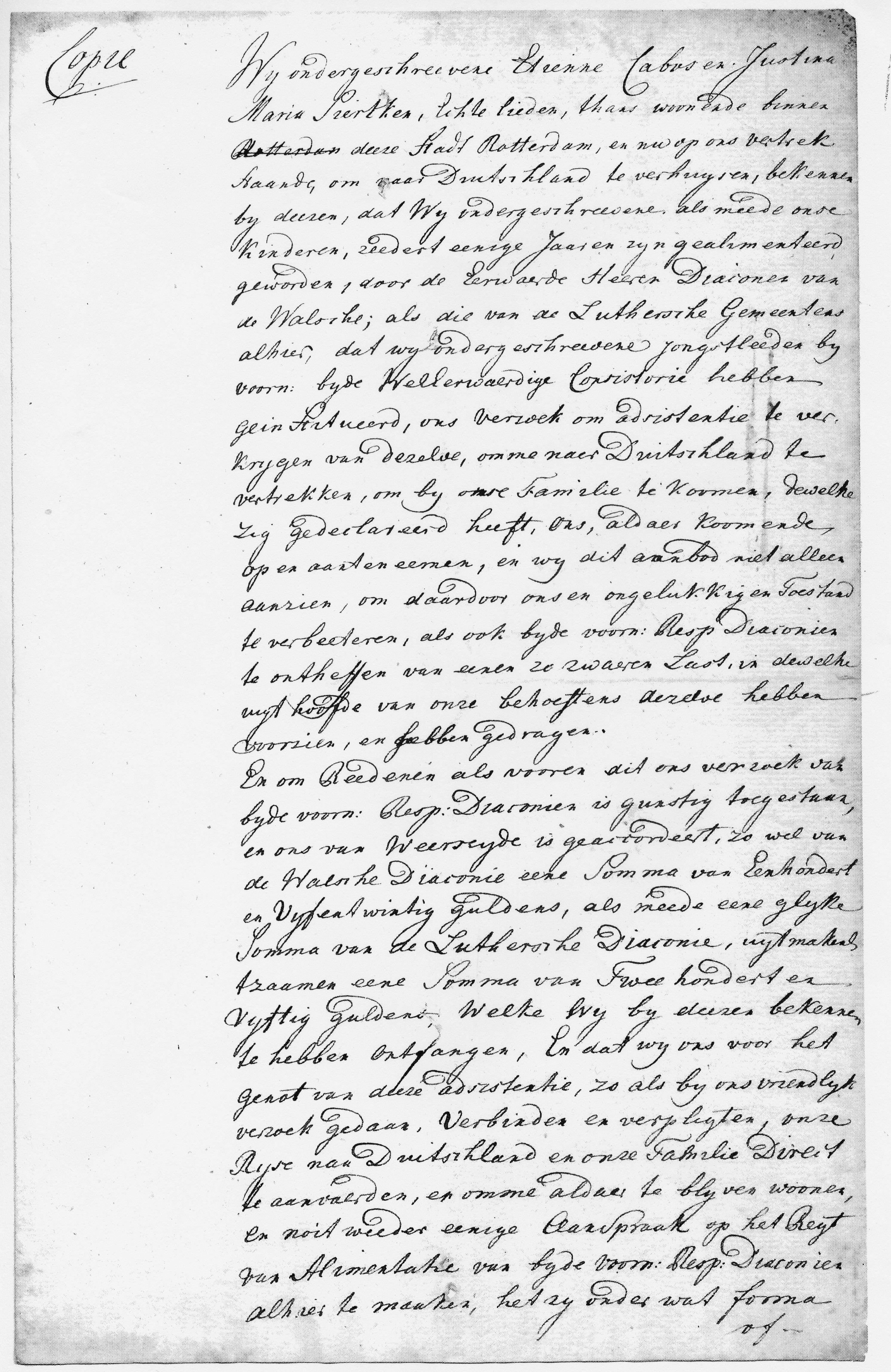 Wir, die unterschreibenden Étienne Cabos und Justine Maria Siercken, edle Leute, zur Zeit wohnhaft in der Stadt Rotterdam, sind zu diesem Zeitpunkt bereit nach Deutschland auszureisen. Wir bestätigen hiermit, dass wir und unsere Kinder seit einigen Jahren Unterhalt bezogen, sowohl durch die ehrenwerten Herren Diakone von den Wallonen, als auch von der hiesigen lutherischen Gemeinde.